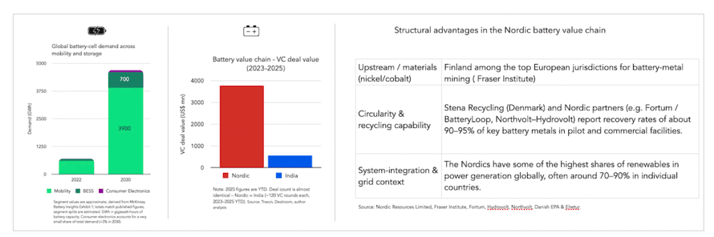 Between 2022 and 2030, global battery-cell demand is expected to rise from about 700 GWh to roughly 4,700 Gigawatt hours (GWh), with mobility accounting for ~3,900 GWh and stationary storage (BESS) for ~700 GWh. In the battery value chain, Nordic and Indian startups have closed a similar number of VC rounds (~120 each between 2023–2025), yet Nordic companies have raised around US$3.7B versus about US$550 million in India, with a higher share of later-stage firms in the Nordics.