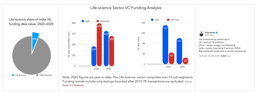 Looked at from the top, the Danish life-science sector already accounts for roughly one-third of the Danish venture capital market. In India, the picture is very different. Between 2023 and 2025, about 7,160 startups across all business sectors raised roughly US$31.1B in VC. Of these, 915 funding rounds and around US$2B went into life-science and HealthTech – about 6% of total VC funding.